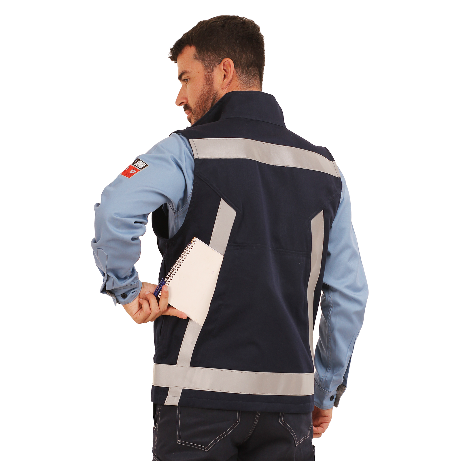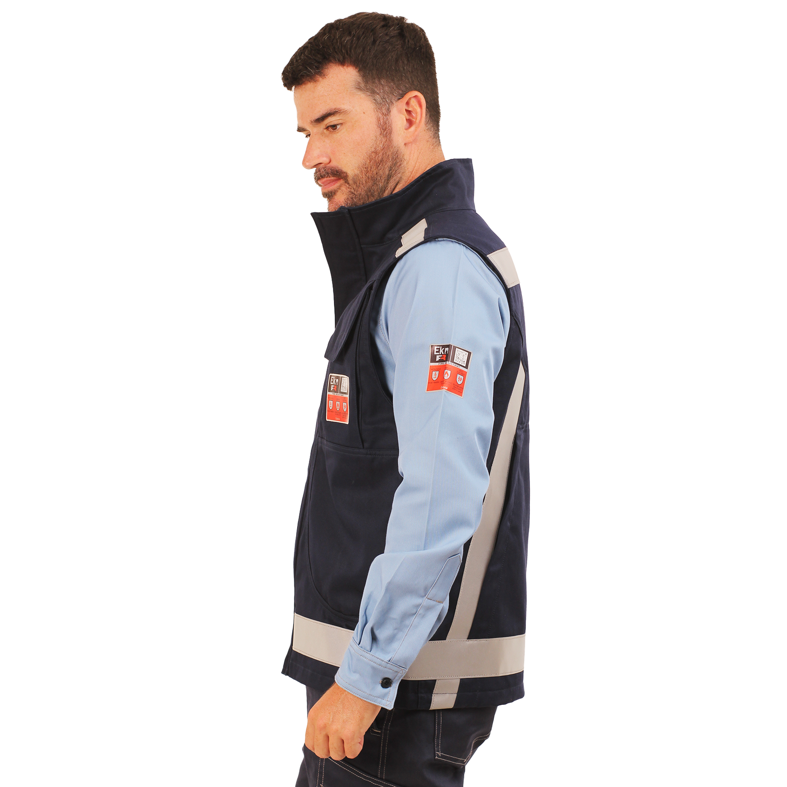 Bolsillo de radio, Diseñado para sostener radios de comunicación. Bolsillos con cierres, Aseguran la seguridad de los objetos almacenados. Bolsillo mapero en la espalda, Proporciona espacio adicional para mapas u otros documentos. Cuello alto, Brinda protección adicional contra las inclemencias del clima. Cinta reflectante, Mejora la visibilidad en condiciones de poca luz o de noche.El geologo risk combina resistencia al fuego con una protección destacada frente a la acumulación de carga electroestática, evitando la atracción de partículas en suspensión y la emisión de chispas. Ideal para aquellos expuestos a riesgos de explosión y arco eléctrico.